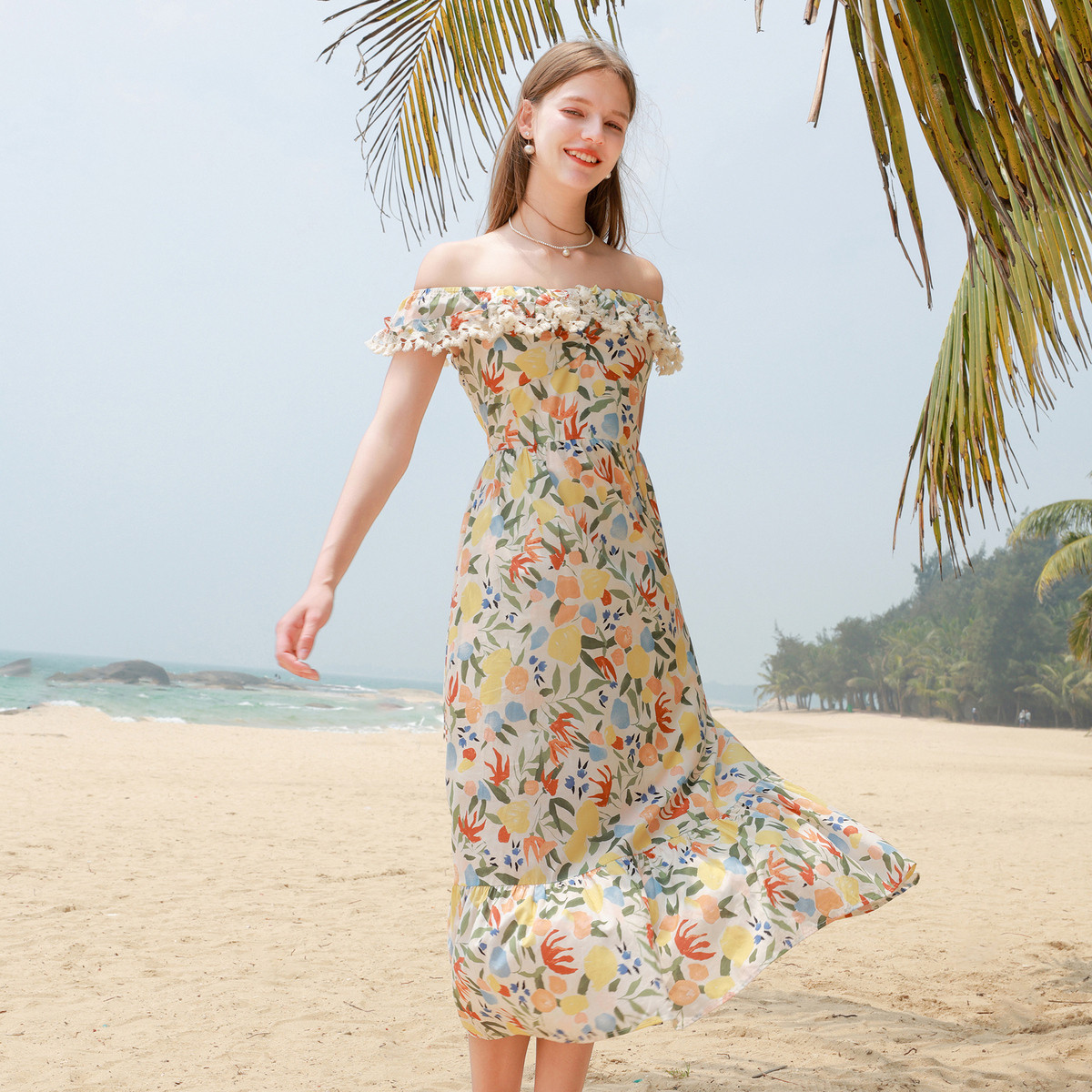 碎花连衣裙流苏拼接收腰A字裙度假风浪漫长裙女